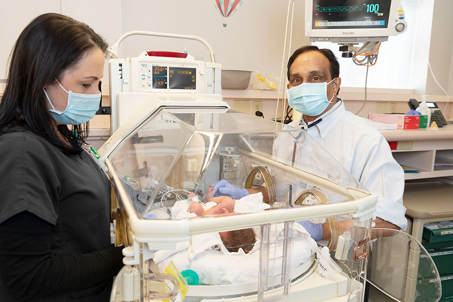 In the NICU, your baby receives care from a team of specialized registered nurses, neonatal nurse practitioners, neonatologists and several other skilled staff. Our NICU team is present during high-risk deliveries to care immediately for the baby and offers access to pediatric surgical specialists for prenatal consultation and surgical planning when needed.