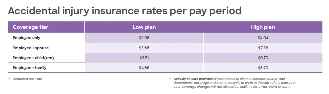 Pay period rates are deducted from your paycheck after taxes. Choose between the high or low plan for your coverage needs.