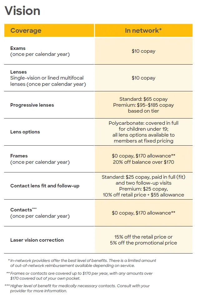 • Frames or contacts are covered up to $170 per year, with any amounts over $170 covered out of your own pocket. Most lenses are covered after a $10 copay.